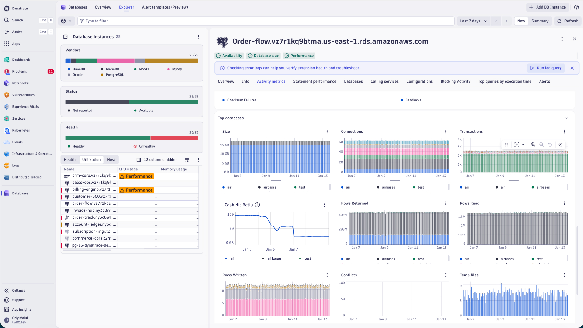 - Gaining deep insights into database operational health by monitoring CPU, memory, I/O, and query times in real-time to ensure optimal performance.